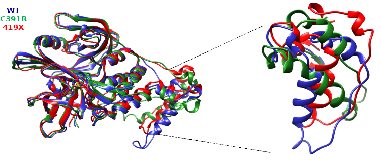 Figure 2.- 3D-superposition of CRBN protein and its mutant versions after molecular dynamics.
