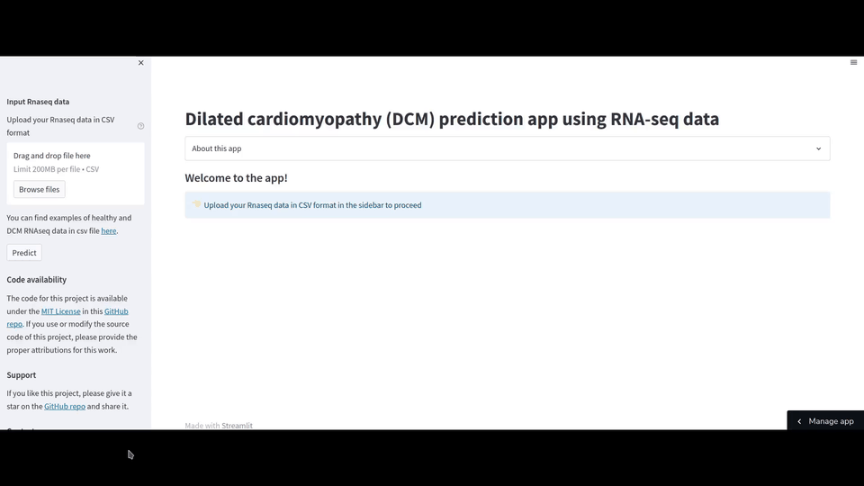 Using the best-performing model of the NF vs. DCM task, we developed CardiomyoPred, a Streamlit web application that allows users to predict the cardiomyopathy etiology of heart tissue samples based on gene expression data for the 94 consensus genes. The source code for this web application is available in this GitHub repository.