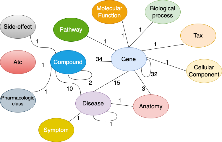 Figure 2.- Metagraph of the DRKG. The number next to an edge indicates the number of relation-types for that entity-pair in the KG. Obtained from [2].