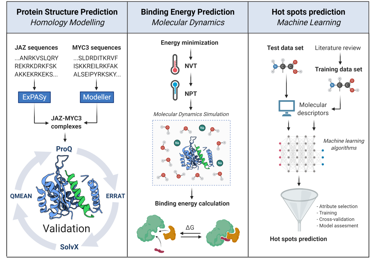 Binding specificity between repressor proteins and a transcriptional factor associated with the jasmonic acid pathway through molecular dynamics and machine learning.