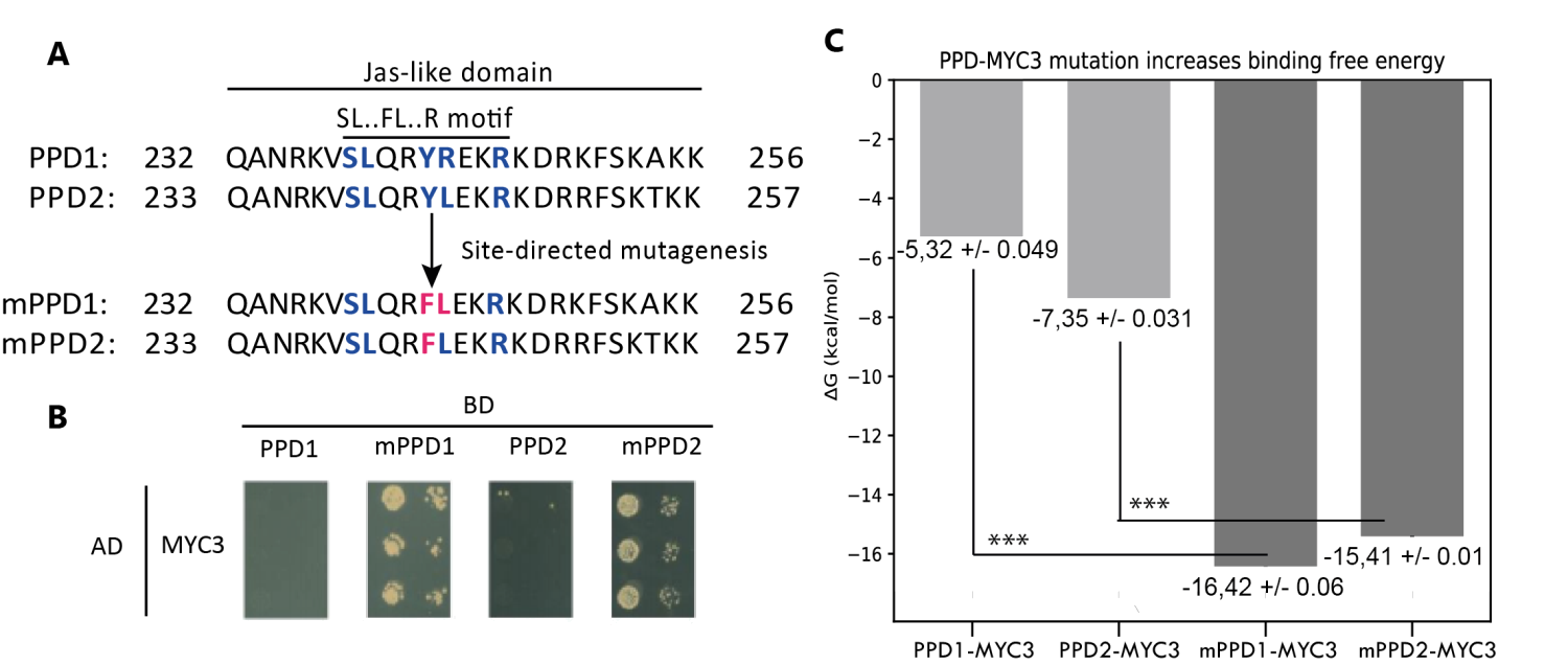 Figure 4.- Site-directed mutagenesis assay of PPD-MYC3 complexes. A) Amino acid alignment showing changes in the Jas-like domain of PPD1, PPD2, and mutants mPPD1 and mPPD2. B) Yeast-two hybrid experiments are showing the favorable change in affinity upon mutation of the SL.FL.R motif in PPD1 and PPD2. C) Predicted free binding energy of PPD1, PPD2, and mPPD1, mPPD2 mutants.