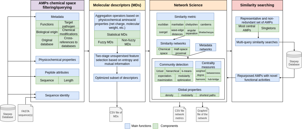 Figure 1.- StarPep modules and components. The software has four main modules to load and filter AMPs, calculate MDs, create and analyze networks, and develop multi-query similarity-searching models.